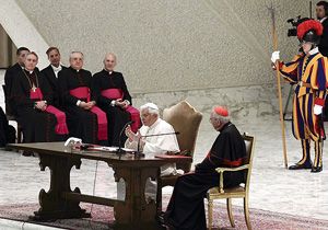 28 Şubat'ta görevinden ayrılacak olan Katolik Hristiyanların ruhani lideri Papa 16. Benediktus, bu sabah Vatikan'ın Papa 6. Paulus Salonu'nda Roma ve çevresinde görev yapan din adamlarıyla bir araya geldi.