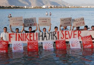 Finike'de, CHP'li gençler sahil kenarında ve denize girerek pankart açarak ''Finikeli Hayır'ı sever?'' dedi. CHP'i gençler, deniz içinde ''Sivil darbeye hayır'', ''Akdeniz'den hayır çıktı'', ''Açılıma hayır'', ''KPSS'ye hayır?'' sloganlarının yazılı olan pankartlar da açtılar.