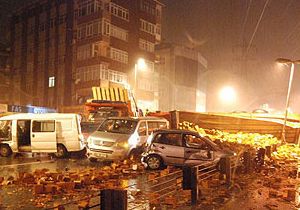 Çarpmanın etkisiyle kamyon devrilirken tuğlalar E-5 karayolu ve metrobüs yoluna saçıldı. Kazaya karışan araçların içinde bulunanlar hafif şekilde yaralandı.