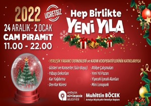 24 Aralık - 2 Ocak tarihleri arasında düzenlenecek Yılbaşı Festivali, kentteki yabancı dernek ve kadın kooperatiflerini Antalyalılarla buluşturacak. Cam Piramit’te gerçekleştirilecek festival, renkli görüntülere sahne olacak. Festivalde yabancı dernek temsilcileri ve kadın kooperatifleri üyeleri kendi stantlarını açarak kültürlerini anlatacak. 10 gün boyunca çeşitli etkinlikler düzenlenecek.