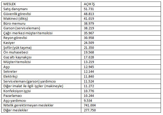 Türkiye'de herhangi bir vasıf ya da mesleki eğitim gerektirmeyen personel ihtiyacı ise 741 bin olarak kayıtlarda yer aldı. Nitelik gerektirmeyen meslekler Türkiye'de toplam açık iş pozisyonunun yüzde 42'sini oluşturdu.