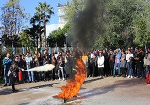 Programda katılımcılara, teorik bilgilendirme sonrası güvenli alanda yangına müdahale, yangın söndürme, yangın tüpünün kullanımı uzmanlar tarafından uygulamalı olarak gösterildi. Personellerin ve öğrencilerin ilgiyle izlediği tatbikatta, kişilerin yangın korkusunu yenmeleri ve cihazları doğru kullanabilmeleri için uygulamalar da yaptırıldı.
