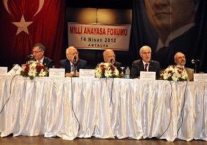 Antalya Atatürk Kültür Merkezi'nde Prof. Dr. Çetin Yetkin başkanlığında düzenlenen Milli Anayasa Forumu'na; eski TBMM Başkanı Hüsamettin Cindoruk, MHP Milletvekili Prof. Dr. Özcan Yeniçeri, Büyükşehir Belediye Başkanı Mustafa Akaydın, Akdeniz Üniversitesi Hukuk Fakültesi Öğretim Üyesi Prof. Dr. Hayrettin Ökçesiz ve İşçi Partisi Genel Başkan Yardımcısı Nusret Senem katıldı.