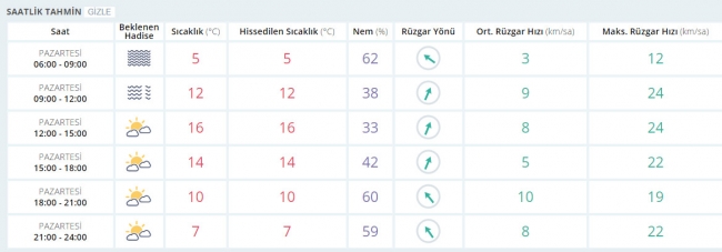 Ülkemizin batı kesimlerinin parçalı, zamanla çok bulutlu, gece saatlerinde Edirne, Kırklareli ve Çanakkale çevreleri ile Balıkesir'in batı kıyılarının sağanak yağışlı, diğer yerlerin az bulutlu ve açık geçeceği tahmin ediliyor. Sabah ve gece saatlerinde iç ve doğu kesimlerde yer yer pus ve sis bekleniyor. Doğu Karadeniz'in iç kesimleri ile Doğu Anadolu'nun doğusunda buzlanma ve don olayı görüleceği tahmin ediliyor.