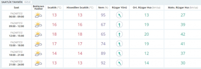 Parçalı ve az bulutlu, zamanla çok bulutlu geçeceği tahmin ediliyor. Rüzgarın; Kuzey Ege kıyılarında güney ve güneybatı yönlerden kuvvetlice (30-50 km/sa) esmesi bekleniyor. Sabah ve gece saatlerinde bölgenin iç kesimlerinde yer yer pus ve sis görüleceği tahmin ediliyor.