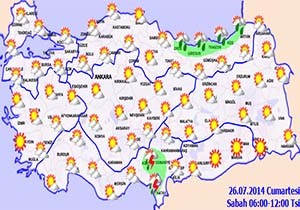 Yapılan son değerlendirmelere göre: Ülkemizin kuzey ve iç kesimleri ile Akdeniz bölgesinin parçalı, yer yer çok bulutlu; İç Ege, Batı Akdeniz, İç Anadolu'nun batısı, Batı Karadeniz'in iç kesimleri, Orta ve Doğu Karadeniz, Osmaniye, Kayseri, Sivas, Kars ve Ardahan çevreleri ile Adana ve Mersin'in iç, Hatay'ın kıyı kesimlerinin sağanak ve gök gürültülü sağanak yağışlı, diğer yerlerin az bulutlu geçeceği tahmin ediliyor.