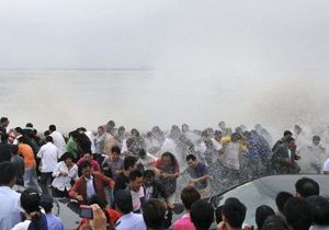 Çin'in Hangzhou bölgesinden geçen Qiantang Nehri'ndeki gel-giti izlemek isteyen yüzlerce turist nehir kıyısına akın etti.