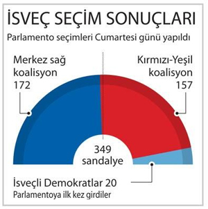 İsveç'te 349 milletvekilinin bulunduğu mecliste Başbakan Reinfeldt'in önderliğindeki merkez sağ koalisyon 172 sandalye kazandı. Sosyal demokratların başını çektiği sol bloğun milletvekili sayısı ise 157'da kaldı. Seçim kampanyalarını İslam ve yabancı karşıtı söylemleri ile sürdüren SD, parlamentoda 20 sandalye kazanarak, iktidar kurma görüşmelerinde kilit öneme sahip güç oldu. Ancak seçimden oy oranını artırarak çıkmayı başaran Başbakan Reinfeldt, ırkçı parti SD ile koalisyon görüşmeleri yapmayacağını açıkladı. Seçimden büyük bir zaferle çıkan SD lideri Jimmie Akesson ise ırkçı oldukları iddialarını reddederek, koalisyon görüşmelerine hazır olduğunu belirtti. Akesson, "Bugün hep birlikte siyaset tarihinde bir zafere imza attık. Bunun müthiş bir şey olduğunu düşünüyorum" dedi.