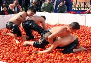 Festivalin en renkli etkinliklerinden olan domates güreşinde ise havuzun içine dökülen yaklaşık 3 ton domatesin içinde kıyasıya güreşen pehlivanlar, domateslerin gözlerini yakması nedeni ile zaman zaman zor anlar yaşadı. Domates güreşlerine Kırkpınar başpehlivanlarından Hasan Tuna ve Ahmet Yavuz da katıldı. Daha sonra erkekler arası halat çekme yarışları gerçekleştirildi.