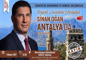 1 Nisan günü Antalaya'ya gelecek olan Sinan Oğan Muratpaşa Belediyesine ait Kültür Salanunda saat13,30' da Türkiye'de Demokrasi ve Güncel Gelişmeler programı dahilinde 'Hayırlı Anadolu Yürüyü' Başlığı ile MHP'nin Eski Iğdır Millet Vekili muhalif kanalındaki partililere ve Antalyalılara seslenecek.