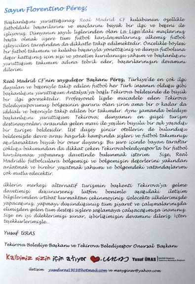 “2008-2009 sezonunun sonunda profesyonel lig olan 3.Lig’e adını yazdıran Tekirova Belediyespor her geçen yıl rüştünü ispatlayarak bölgesinin gururu olmaya devam ediyor. İlklerin merkezi olan Tekirova’nın gözbebeği olan futbol takımızla Real Madrid’in özel maçta bir araya gelmesi için İspanyol temsilcisinin başkanı Florentino Perez’e mektup yolladık. Son günlerde Avrupa fatihimiz Galatasaray’ı üzen Real Madrid’le biz de maç yapmak isteriz. İnşallah mektubumuza olumlu dönüş alırız ve dünya devi ile özel bir maç yaparız. Kazanan elbette Tekirova, Kemer, Antalya, Türk Futbolu ve Türk Turizmi olacaktır. Ama biz yine de iddialıyız” dedi.