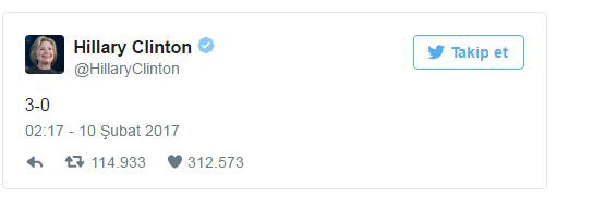 Seçimlere Demokrat Parti adına katılan ve kaybdenHillary Clinton, sosyal medya hesabından 3-0 yazarak Trump'a göndermede bulundu. Bu tweet 100 binin üzerinde paylaşıldı.