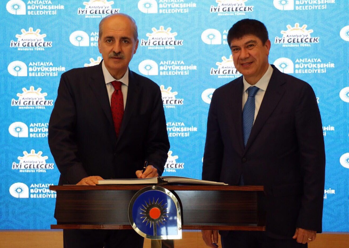 Bakan Numan Kurtulmuş, partiden Antalya Büyükşehir Belediyesi'ne geçti. Büyükşehir Belediye Başkanı Ak Partili Menderes Türel'in karşıladığı Kurtulmuş, burada hatıra defterini imzaladı.